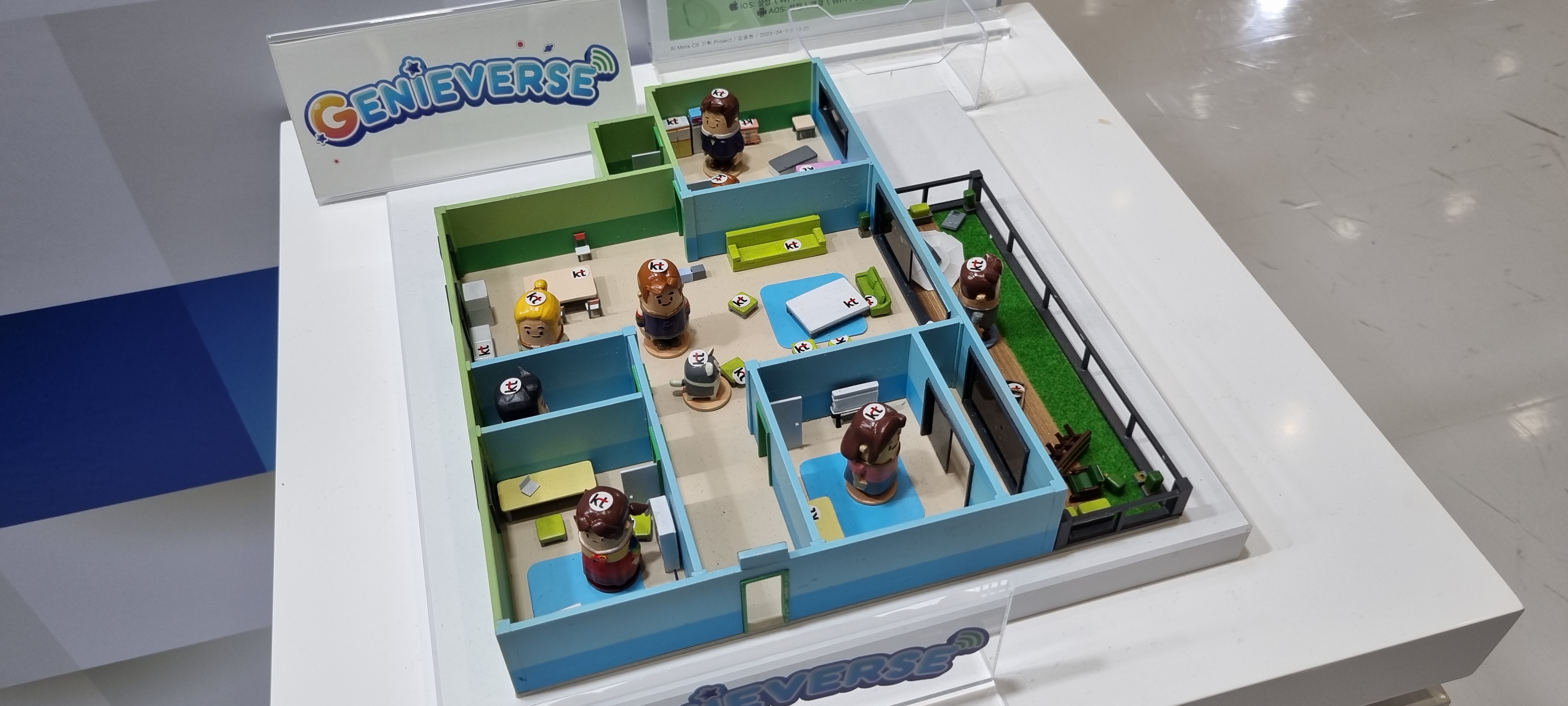 도우미 한 분과 직원 여러 분들께서 설명 해 주셨고, 오른쪽에는 지니버스 케릭터와 지니버스 내의 집(지니홈) 모형이 놓여 있었습니다.