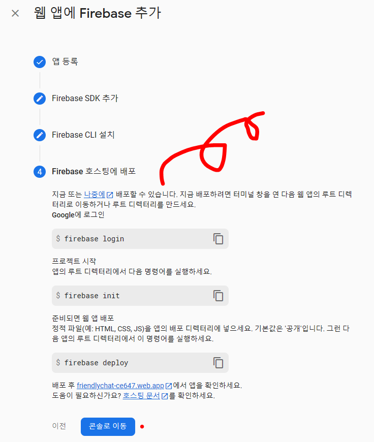 호스팅 배포 내용도 나중에 나오니 요건 패스하는 것으로 하고, 가장 아래 '콘솔로 이동'을 눌러 앱 생성을 마무리 합니다.