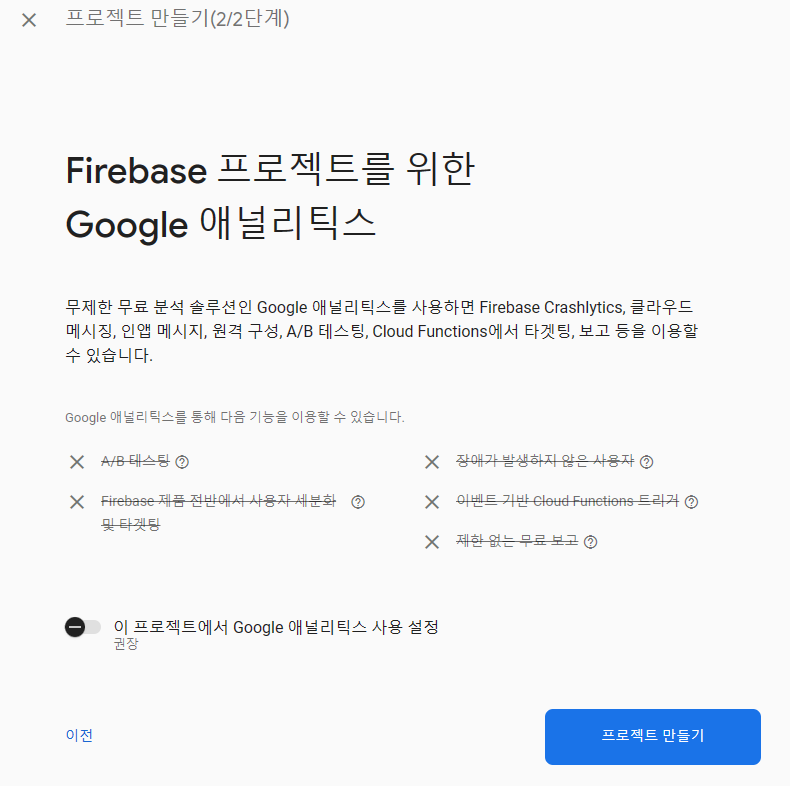 다음 화면에서 분석 하지 않도록 애널리틱스를 해제하는데, 해제 해야 하는 특별한 이유는 나오지 않습니다만, 아직 상용을 목적으로 하지 않으니, 불필요하게 리소스를 쓸 필요도 없고, 쓰지 않도록 해두겠습니다.