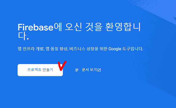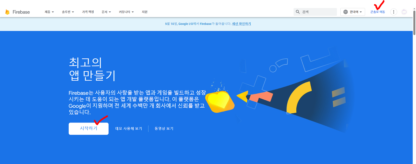 프로젝트 생성은 모든 프로젝트 관련 된 처리를 하는 콘솔로 가서도 할 수 있고(아래 그림 우측 상단 체크 표시), 처음 사용하면 시작 화면에 바로 가는 버튼이 있기도 합니다.
