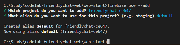 아래와 같이 CLI를 통해 프로젝트와 연결합니다. 프로젝트 별명은 다르게 지어도 상관 없나 봅니다.