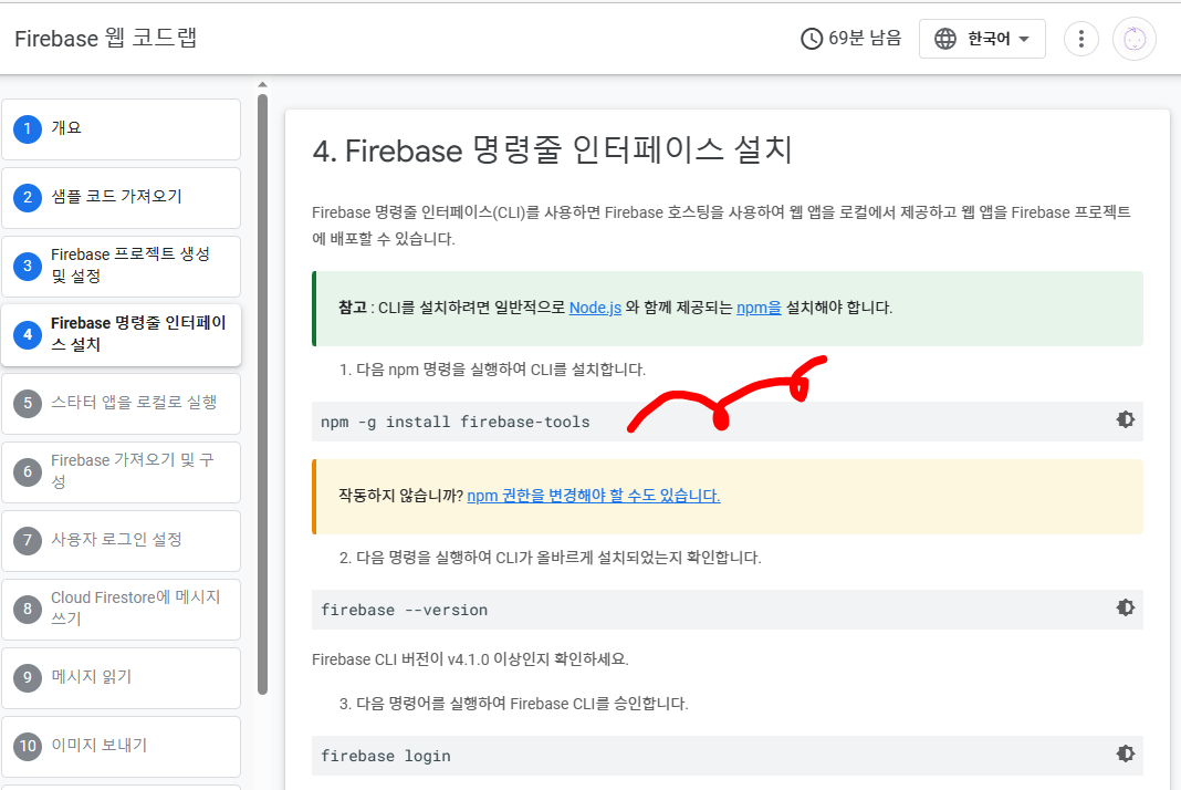 Codelab 가이드 문서의 다음 순서는 CLI 설치 입니다. 이건 Firebase SDK 설치 할 때 나왔던 내용이라 저는 미리 했었는데, 지금 하는거랑 그때 하는거랑 차이는 없을 것 같네요.