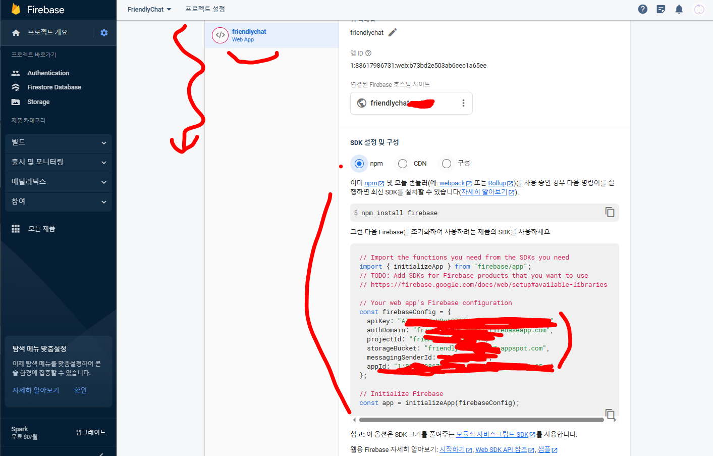 아래로 스크롤하여 프로젝트 내 앱의 설정 정보로 이동하면 프로젝트 처음에 시작 할 때 보았던 그 내용을 다시 볼 수 있습니다. 이제 npm으로 필요한 설치를 다 했으니 그 내용 그대로 따라 하면 되겠네요. 앞에서 미리 해두었으면 다시 할 필요는 없습니다.