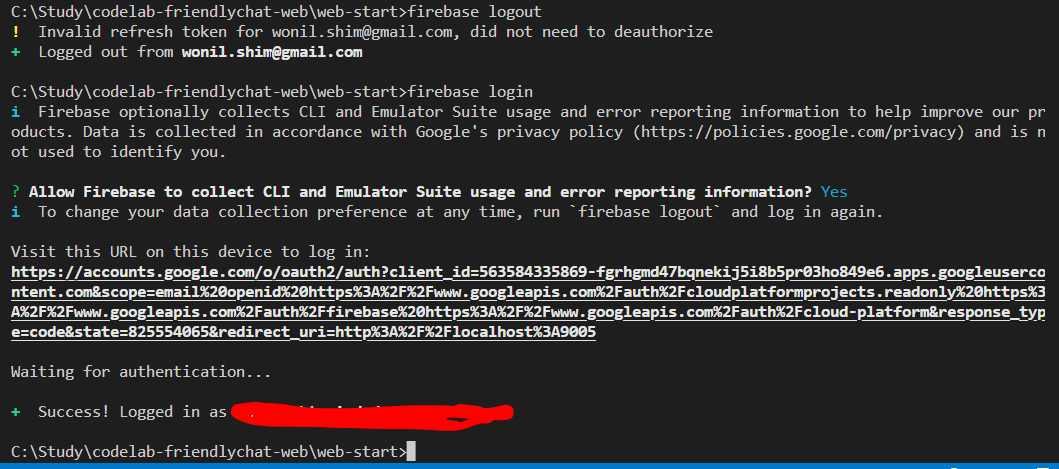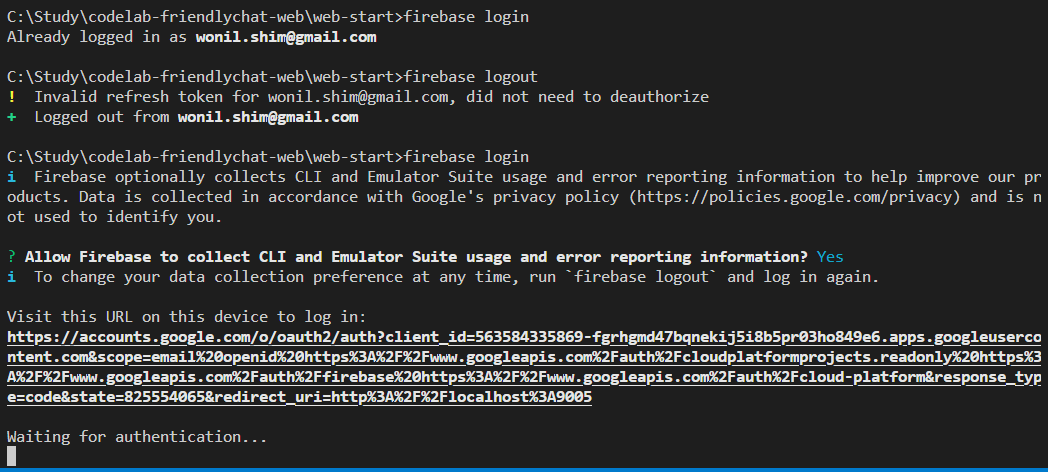 가이드 내용에 따라 로그인을 하려고 했더니 이미 로그인 되어 있다고 나오는데, 그 계정이 저의 다른 구글 계정이었습니다. 예전에 Firebase CLI로 했던 작업에 사용했던 계정인데, 그때 쓴 기록이 있어서인지, 혹은 브라우져 자동 로그인 설정을 한 것 때문인지 모르겠지만, 지금 진행 중인 과정의 Firebase 계정이 아니라면 로그아웃을 한 후 다시 로그인을 하면 됩니다.