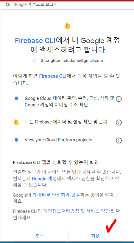 Firebase console에서 프로젝트를 만들었던 그 계정으로 로그인~