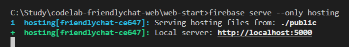 이제 현재까지 만들어진 것을 웹으로 띄워 볼 차례입니다. 지금까지 별 다른 코드를 작성한 것은 없으므로 제공 된 샘플 그대로를 띄워 보는 것입니다. Firebase에서는 웹 호스팅도 제공하는데, 로컬에서 개발하여 테스트를 한 후, 정식 서버로 배포를 해주는 형태로 진행 된다고 보면 됩니다.