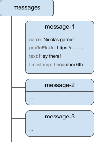가장 위에 컬렉션이 있고(위 그림의 경우, message, fcmTokens), 컬렉션 하위에 문서가 추가 됩니다. 문서는 이름을 지정 할 수도 있고, 이름을 지정하지 않고 문서를 추가하면 위 그림처럼 임의의 이름을 시스템이 지정 해 줍니다. 중복 문제 등을 고려하면 그냥 자동 생성도 좋은데 뭔가 쿼리 같은 것을 쓸 필요가 있다면 이름을 지정 해 줄 수도 있죠. 문서는 JSON 형태로 필드명과 속성으로 구성 됩니다. 이런 것은 설계 단계에서 미리 정의가 되어야 하는데, 이 예의 경우, 아래와 같은 구조를 가지고 있도록 설계 했다고 합니다. 이런 자료도 살펴보고 향후 자신의 서비스 개발에 참고하여 자신의 서비스 데이터 구조를 이런 형태로 표현 해 보면 도움이 될 것 같습니다.