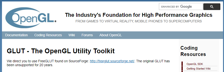 GLUT - The OpenGL Utility Toolkit We direct you to use FreeGLUT found on SourceForge: http://freeglut.sourceforge.net/. The original GLUT has been unsupported for 20 years.
