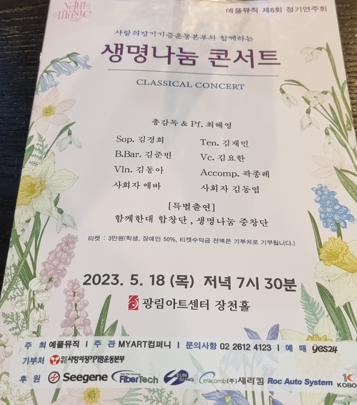 아티스트분들의 무대는 공연의 제목처럼 '생명나눔'의 사랑과 같이, 감동을 주는 무대였습니다. 향수를 자극하는 영화 음악 연주(김요한, 김동아)부터 마음을 울리는 가곡들(김경희, 김재민, 김준빈, 곽종례). 특히나, 오페라 '사랑의 묘약'의 두 곡은 노래도 노래지만, 연기가 정말 일품이었습니다. 꼭 언제고 공연을 봐야겠다 싶은 마음이 들었어요.