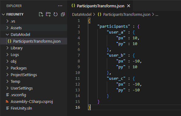 string json = "{ 'participants':{ 'user_a':{ 'px':10,'py':10},'user_b':{ 'px':-10,'py':10},'user_c':{ 'px':-10,'py':-10} }";