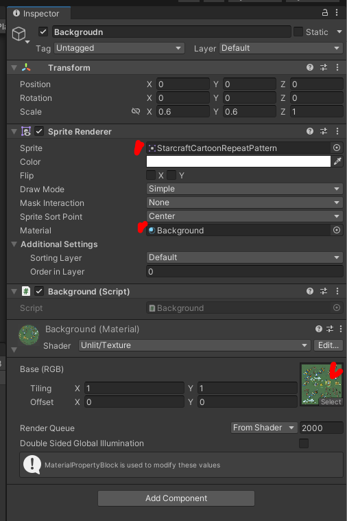 배경 화면 스크롤을 하려면 배경 스프라이트를 재질에도 적용 해 줘야 합니다.