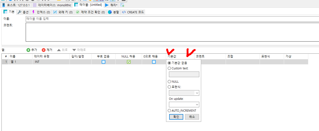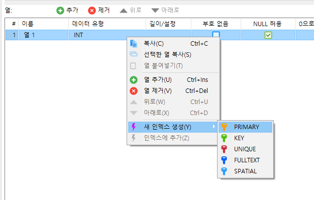 이 속성을 PRIMARY KEY로 설정하는 것은, 행이 선택 된 상태에서 context menu를 통해서 할 수 있습니다. 저런 설정을 '새 인덱스'라고 하는군요. @_@a.