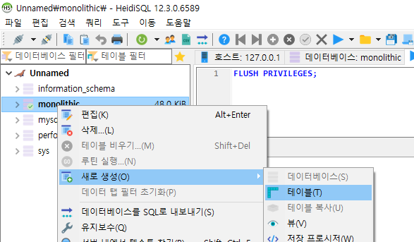 거의 같은 방법으로, DB를 선택한 상태에서 생성을 통해 테이블을 생성 할 수 있습니다.
