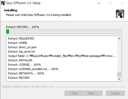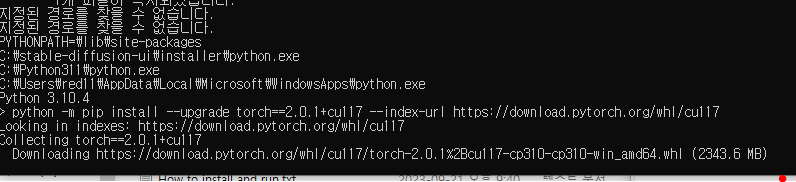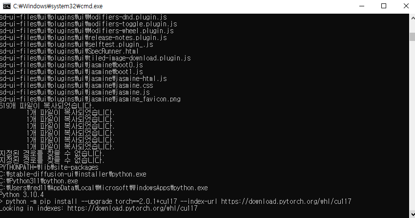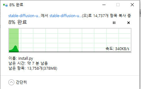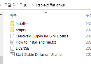 'Start Stable Diffusion UI.cmd'를 눌러 실행하면, 첫 실행이라서 필요한 여러개의 파일들을 다운로드 받습니다.