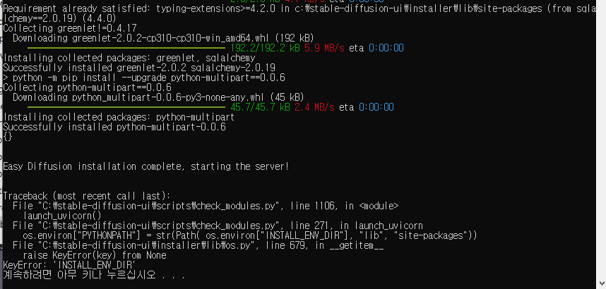꽤 오래 설치를 한 후, 설치 완료와 함께 오류 메세지가 떴는데, 모듈 체크 에러인데...엔터를 치면 그 다음 과정이 실행 되는데 또 에러가 뜨고...