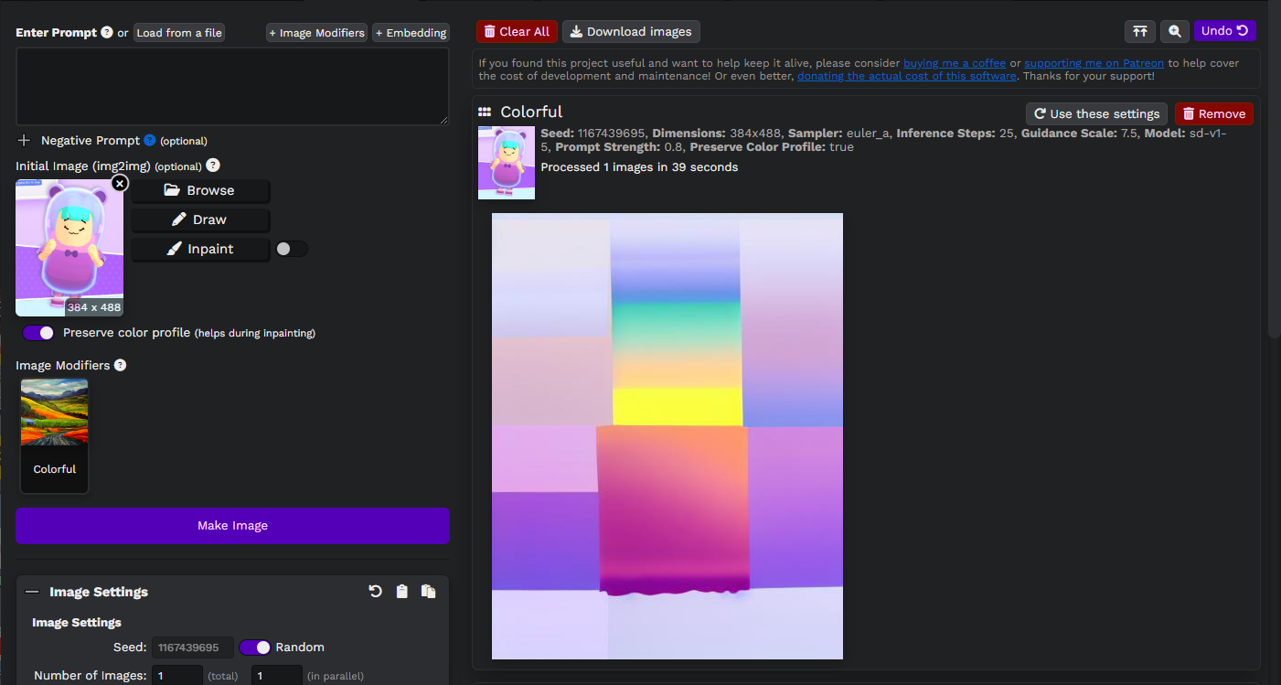 아마도 이미지 생성을 위한 조건을 좀 더 구체적으로 줘야 할텐데, 텍스트 프롬프트는 주지 않고, 설정은 기본값만 쓰고 있으니 뭔가 나오기 어려운 것 같습니다. 그리고, 젤리 케릭터도 사람처럼 잘 보이지 않으니까요.