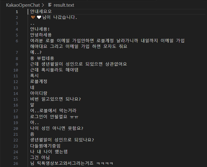 로블록스 관련 된 오픈채팅방 대화를 구해서 사용 해 보겠습니다.