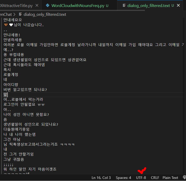 한 가지 마음에 걸리는 것은, 아이폰에서 저장한 대화 파일을 압축을 풀 때 오류가 있었습니다. 그러나, 파일 읽을 때는 문제가 없어서 그냥 사용했고, 특히나 저장은 별도 파일로 따로 utf-8를 지정하여 저장했기 때문에 문제가 없을 것으로 생각했습니다. 그 문제 말고는 특별히 문제가 될 것이 없는데 무슨 일인지 모르겠네요. @_@ euc-kr, ANSI도 안되고...