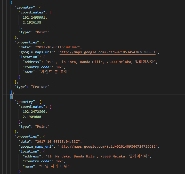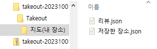 압축을 풀어 보면 아래와 같이 저장 된 것을 볼 수 있습니다. 리뷰는 내가 특정 장소에 남긴 댓글 목록입니다. 우리는 '저장한 장소.json'을 쓰면 됩니다. 그런데 폴더 이름과 파일 이름도 언어 설정에 따라 달라지니 좋기도 한데, 해당 파일 처리하는 입장에서는 좀 번거롭겠네요. 사용자의 언어 설정을 모르니, 사용자보고 파일 이름을 rename 하라고 하거나, 파일 이름을 직접 입력하라고 하거나, 특정 폴더에 넣거나 등등... GUI를 사용하게 되면 file select UI를 쓰면 되겠고, 아니면 실행 파일과 같은 경로 내에 json 파일이 하나만 있으면 그것을 쓰도록 해도 되겠고... 암튼, 그런건 나중의 일이니 일단 패스~