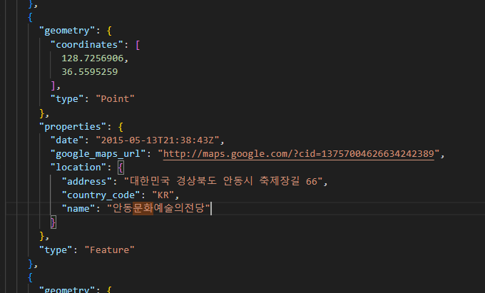 일반 사용자들의 접근이 쉬운, 웹 기반의 변환기도 인터넷에 있는데, 세부 정보가 들어있는 부분이 그냥 JSON 문자열의 한 컬럼으로 들어가 있어서, 구글맵에서 바로 쓸 수가 없었습니다. 목록 중 하나의 데이터는 아래와 같이 구성되는데, 모든 Depth를 다 풀어도 크게 문제가 없을 것 같아 보입니다.