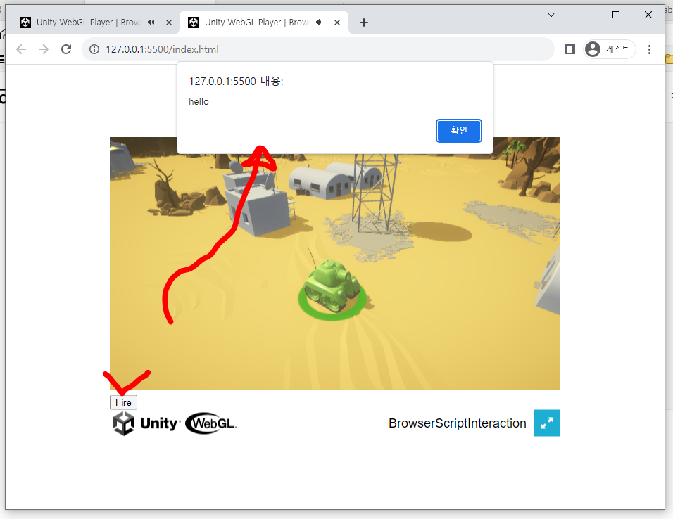 이제 웹 페이지(편의상 index.html이라고 가정하고..)에서 Unity 내부의 함수를 호출하는 방법을 알아보겠습니다. 예를 들면, 웹 페이지에 있는 어떤 버튼을 누르면 유니티 내부의 탱크가 발사를 하는 형식이 되겠네요.