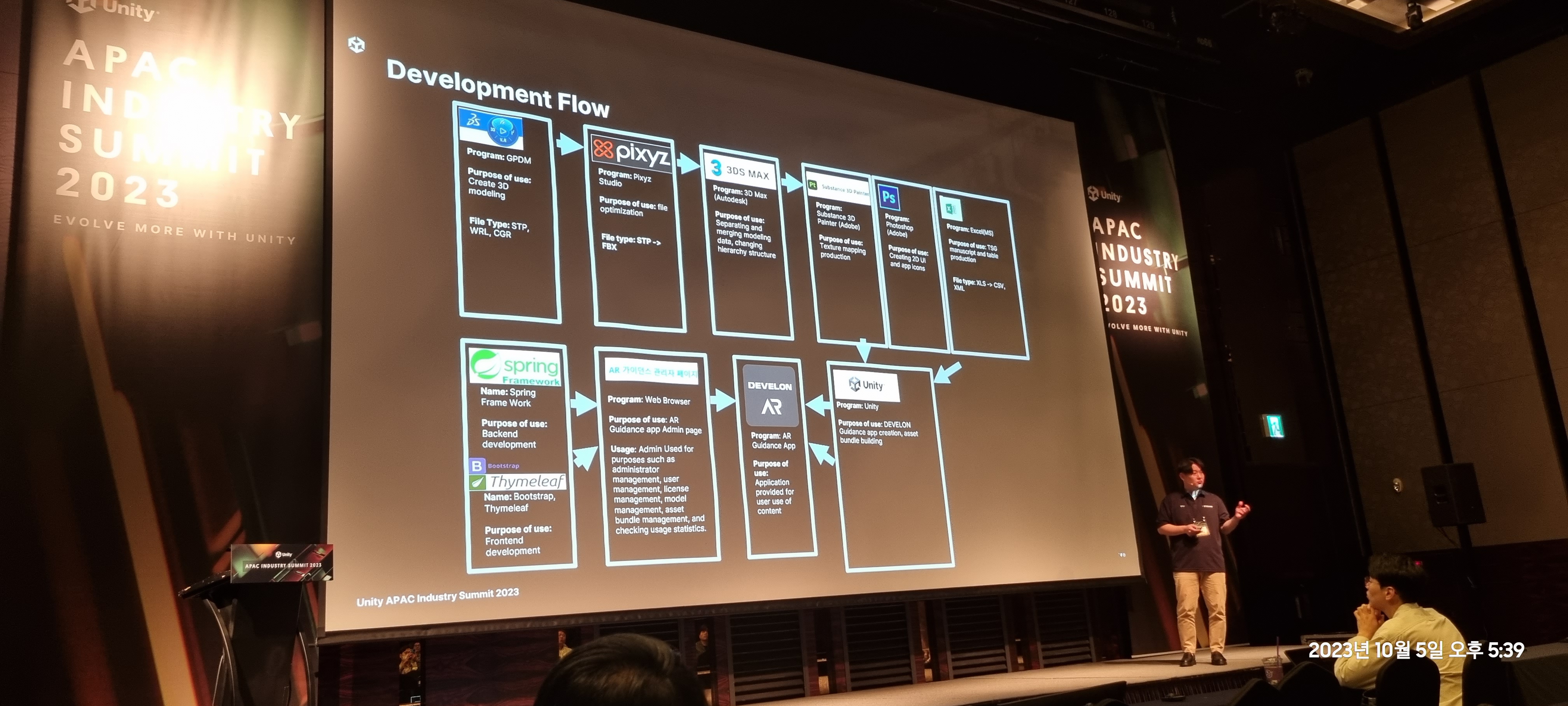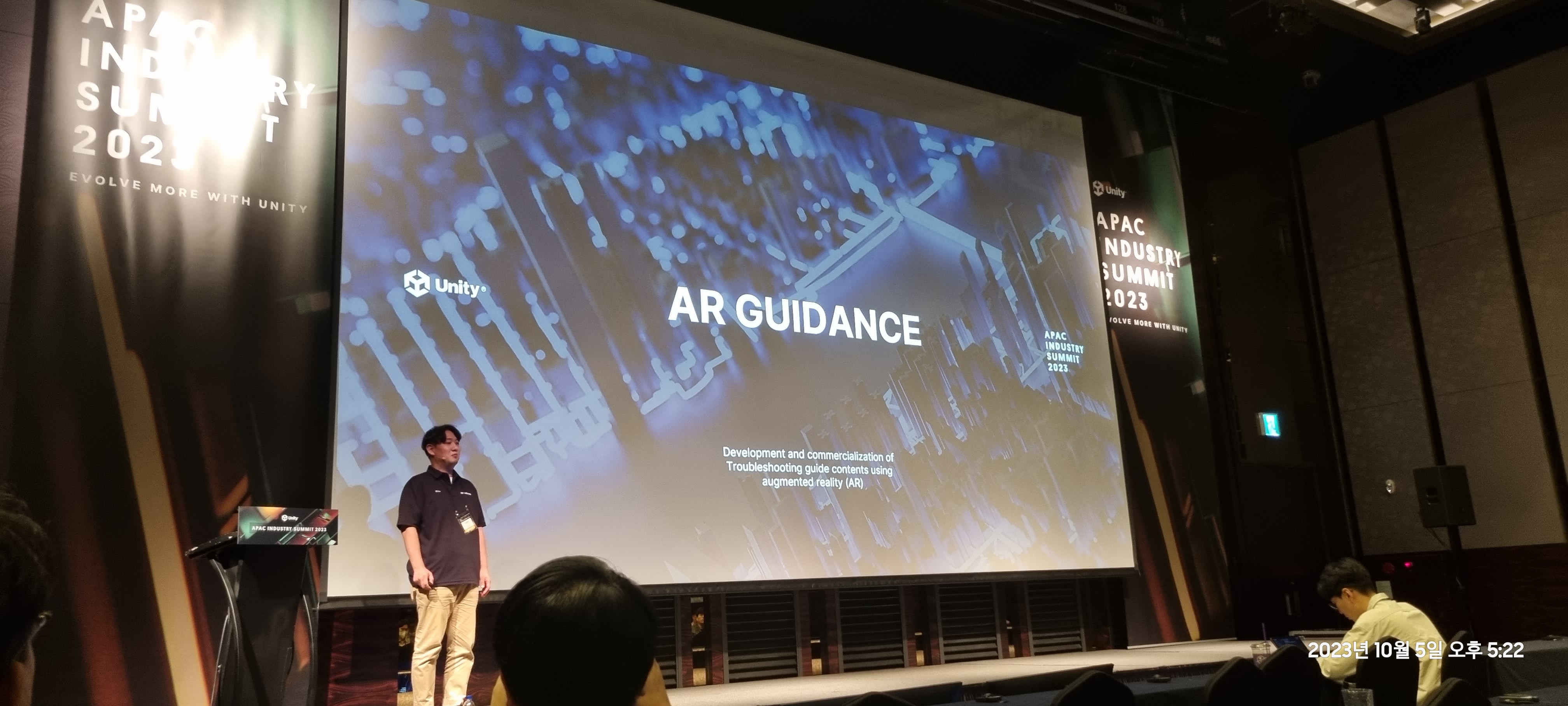 다시 기업 적용 세션으로 가서, 현대인프라코어. 두산인프라코어는 알아도 현대인프라코어? 인수 된다는 기사를 본 것 가티도 해서 찾아보니 맞네요. 예전에 BobCat 인수하며 중장비 쪽 했었는데. 여기도 '나름' 확실한 목적을 갖고 있었습니다. AR을 이용해서 기술 지원을 해주는 용도로 쓰고 있다고 소개 해 주셨어요.그런데, AR 구현 수준이 실제 기계와 딱 맞춰지고 그 위에 증강해서 보여주는 그런 형태는 아닌 것 같았어요. 단순히 카메라 영상을 배경으로 하고 Overlay 된 상태에서 보여지는 것 같기도 하고... 구현 된 내용은 정확하게 잘 확인 할 수 없었고, AR의 어떤 기술을 어떤 문제를 해결하는데 사용했는지는 정확히 파악 할 수 없었습니다. 일단 AR 기술로 파트너들의 기술지원을 훨씬 잘 할 수 있게 되었다고 하셨습니다.