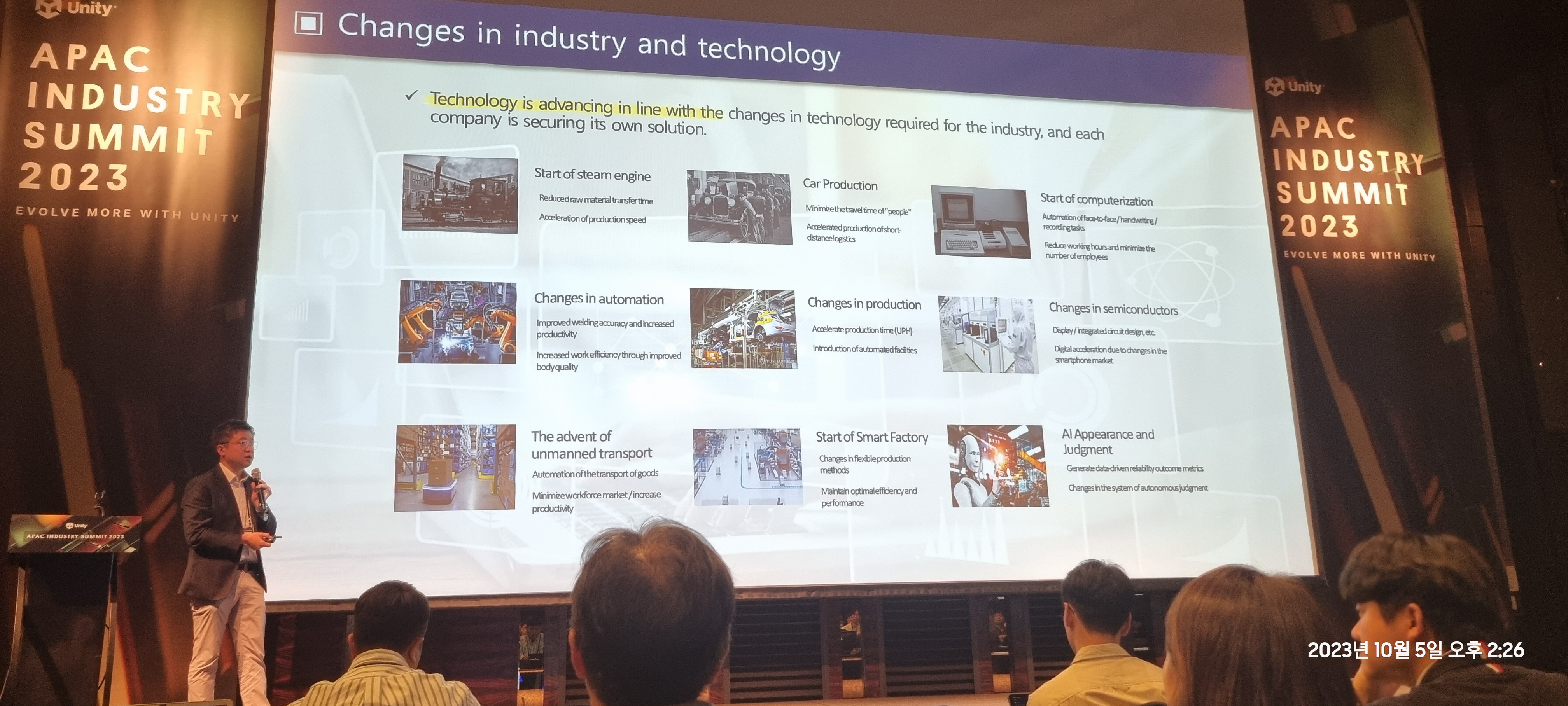 현대자동차 발표를 들으러 갔습니다. 현대자동차는 생산 라인을 3D로 관리하는 시스템을 만든 것을 발표했는데, 제 개인적으로는 이 행사의 최고 발표였다고 생각 됩니다. 가장 훌륭한 점은, "왜 3D인가"에 대한 매우 확실한 목적이 있었기 때문이었습니다. 정말 수많은 개발 기술들을 돌고 돌고 돌아서 마침내 가시화 하는 방법까지도 효율적/직관적으로 하기 위해 유니티로 가시화를 한 것 같았습니다. 이 사례가 왜 감동적이냐 하면, "일단 보기 좋고 멋지게 3D로 만들어봐!"라고 시작하는 시스템들이 너무 많기 때문이죠.