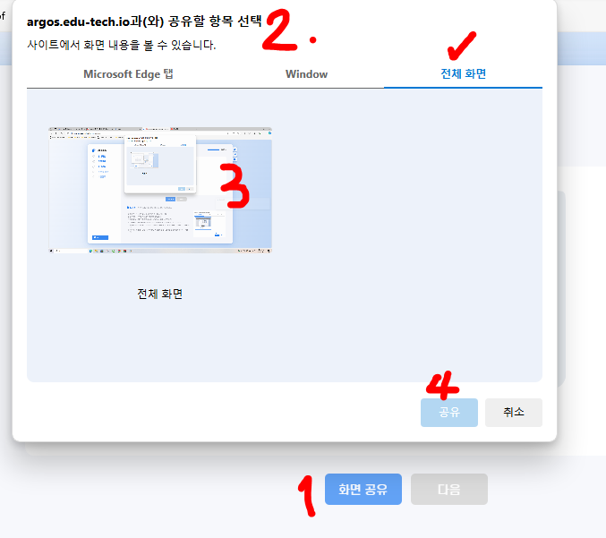 화면 공유 화면이 나오면, 먼저 화면 공유 버튼을 눌러 설정 팝업을 띄운 후, 전체 화면 공유를 선택합니다.
