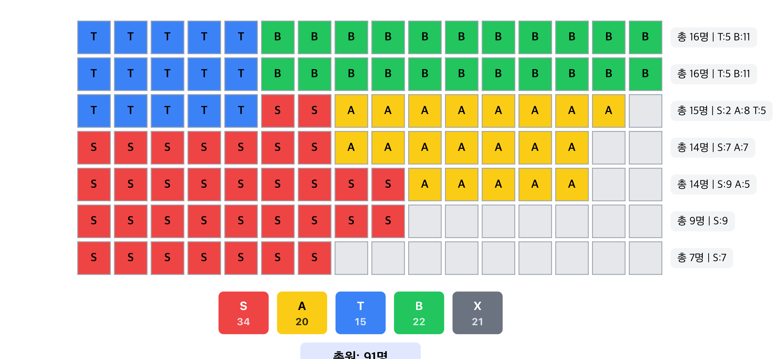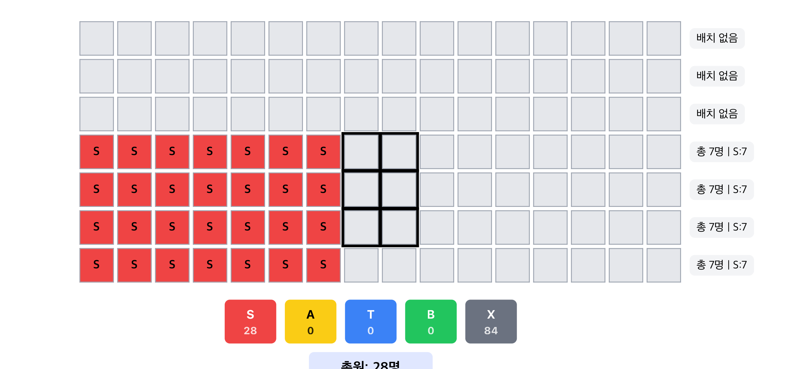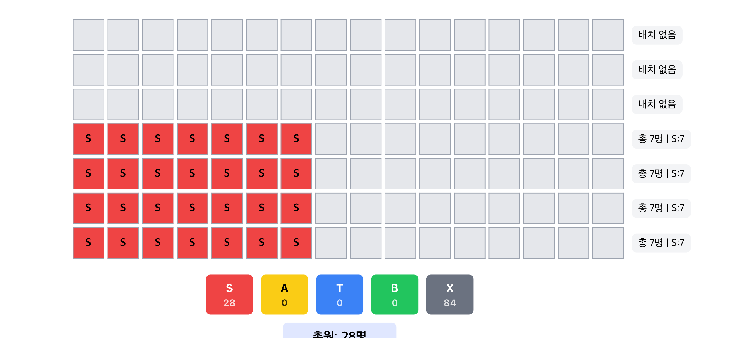 배치가 이뤄지면 각 줄별로 배치 된 인원과 파트별 인원도 오른쪽에 표시되며, 전체 총원은 아래에 표시 됩니다.