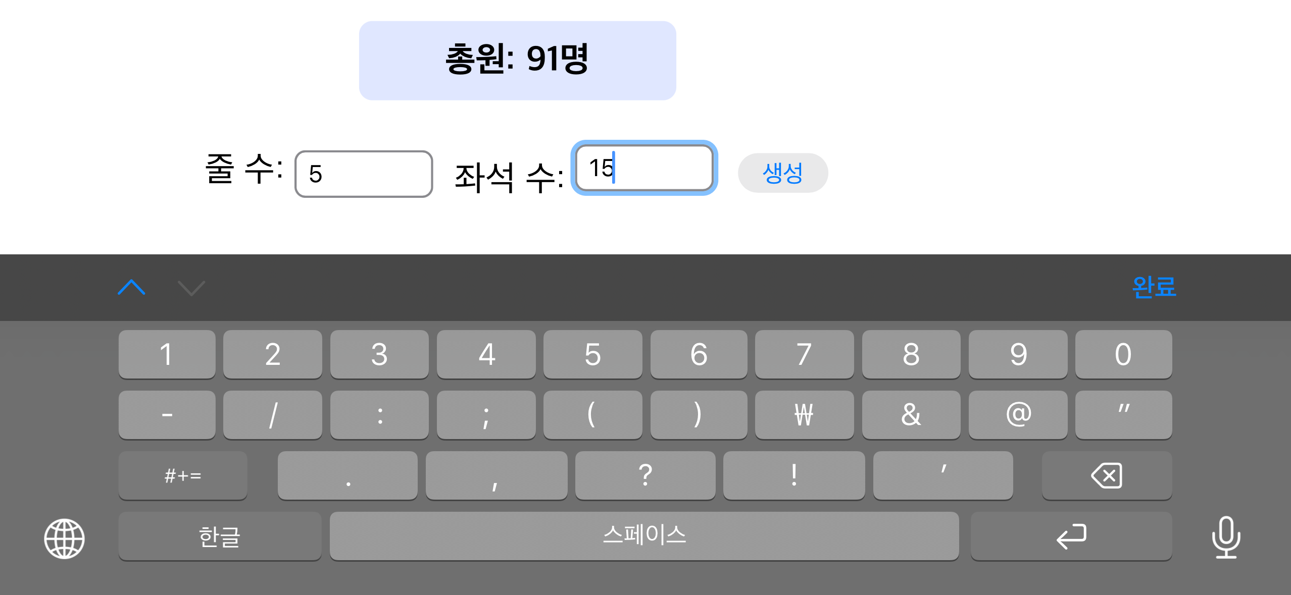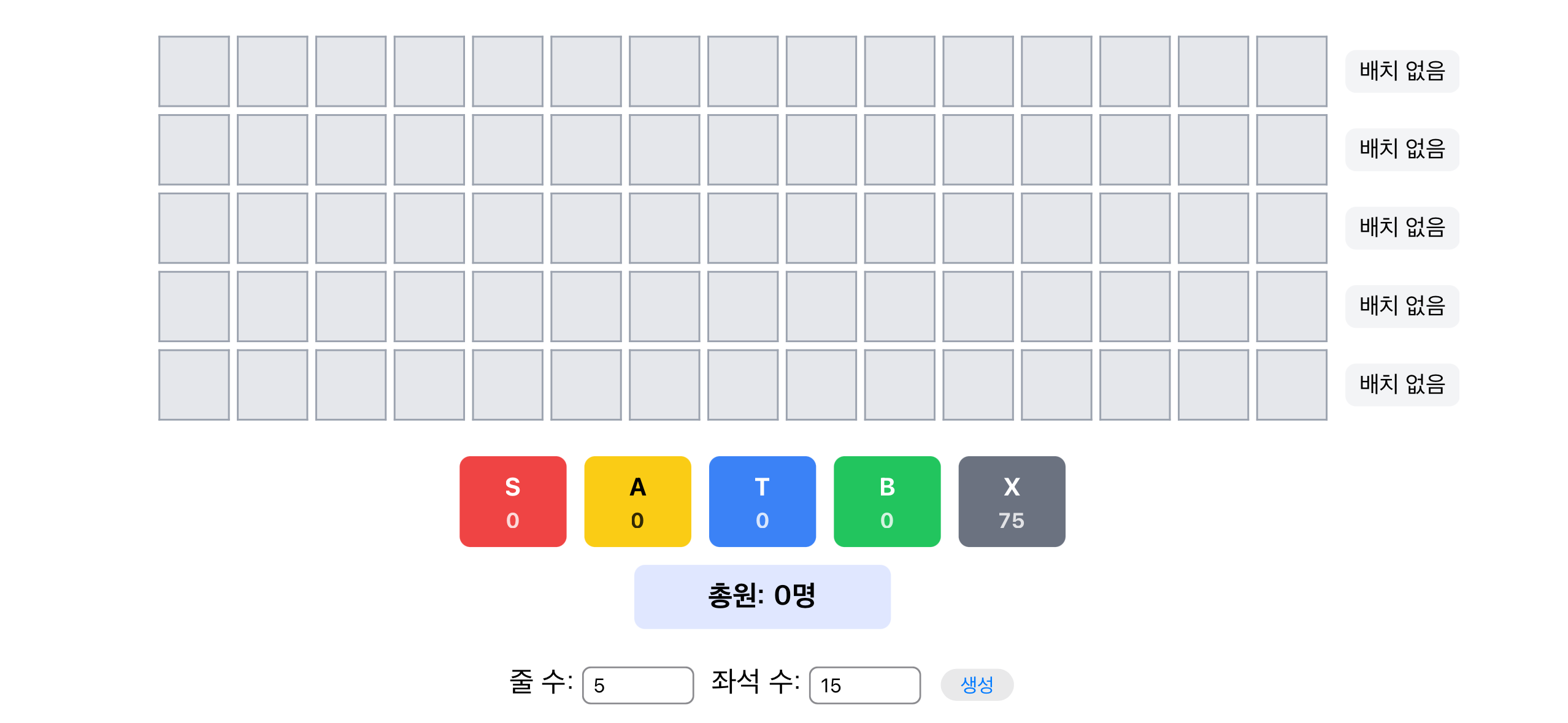 아래 그림은, 원래 크기보다 작은 규모의 단체가 사용하는 경우로 가정하여, 15석 5줄로 입력하고 생성을 누른 모습입니다.