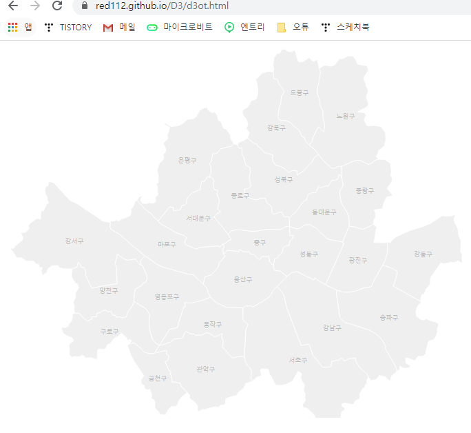 결과는 아래와 같이 서울 지도가 짠~ 나왔습니다. SVG 속성이나 초기값 설정 등은 차차 알아보도록 하죠.