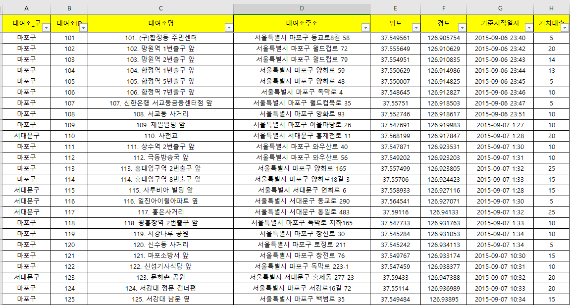 엑셀로 정리 된 문서를 받을 수 있고, 컬럼 중 위도/경도가 있으니 표시 가능하겠네요. 나중에 구별로 사용량 비교를 한다던가 할 때 구 정보가 필요하겠네요.