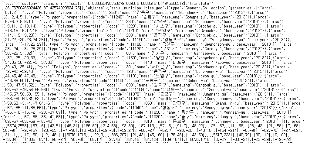 JSON으로 된 서울지도는 아래와 같은 내용으로 되어 있습니다.