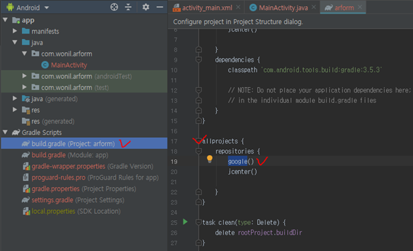 다음으로, 필요한 모듈을 받을 수 있도록, Project의 build.gradle에 구글 레파지토리를 연결 해 둡니다.