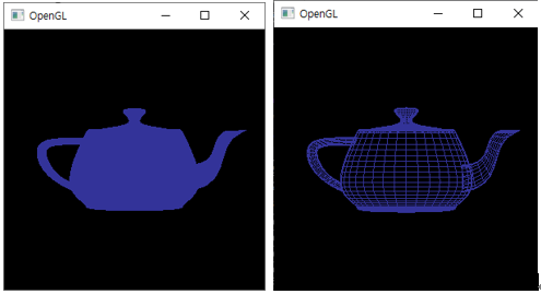 이제 Shader 내부에서 좌표를 변경했을 때 어떻게 되는지 살펴보겠습니다. 그 영향이 잘 드러나도록 Vertex가 많은 주전자를 이용해보겠습니다. 그리고, 아직 조명이 적용되지 않았기 때문에 Solid Teapot은 위치의 변화를 나타낼 수 없으니, Wireframe Teapot을 사용하겠습니다.