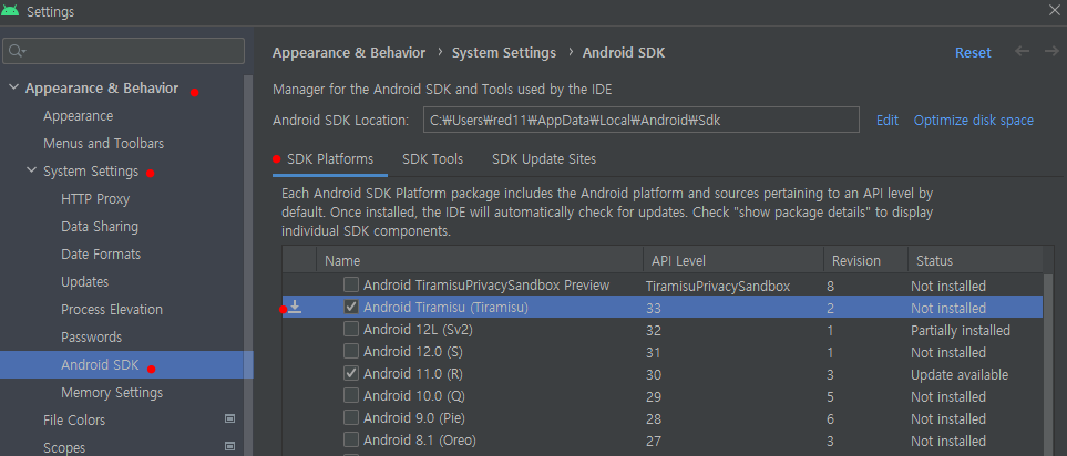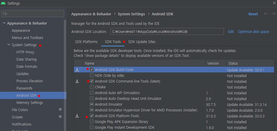 Android Studio에서 SDK 설치 경로 잘 체크 해 두실 필요가 있습니다.