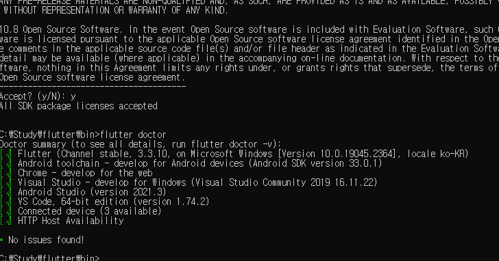 이 상태에서는 위에 보이는 것 처럼, 'flutter doctor --android-licenses'를 실행하니까 동의 과정이 진행됩니다. 음...내용을 모르겠습니다만....일단 다 y로..... 읽어봐야 될 것 같긴한데...-_-a....