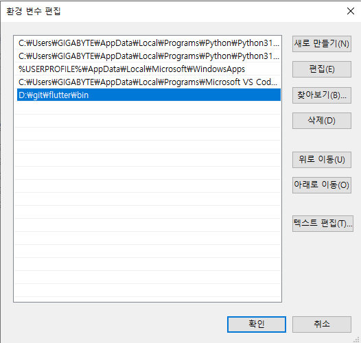 Flutter를 어디서나 실행 할 수 있도록 Path에 Flutter 경로를 추가하면 됩니다. 윈도우 환경 변수에 경로 추가하는 것은 간단하고 자료도 많으니 여기서는 Pass~ flutter 밑의 bin을 추가하면 된다는 것만 잘 기억합시다.