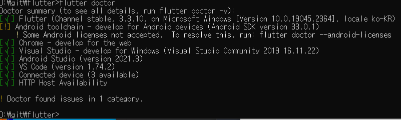 다른 준비가 다 되었다면, flutter doctor에서 다음과 같이 나옵니다.(단, flutter doctor는 위의 2,3 과정에 대해서는 체크하지 않습니다. Device나 Emulator를 사용하지 않을 수도 있으니까 그런 것 같네요.)