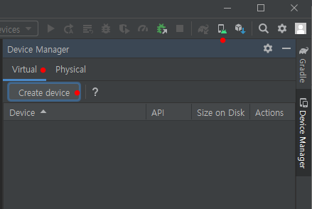 Android Studio가서 가상 단말을 만들어두라고 하는데, Android Studio에서 앱을 개발 해 보셨다면 별로 어려운 과정은 아닐 것입니다. AVD Manager 아이콘은 예나 지나 별로 달라진 것 같지는 않은데, 위치나 매뉴 경로 이런 것은 유지되고 있는지 모르겠네요. 돌핀 버젼을 기준으로 글을 쓰고 있는데, 툴바에서 접근이 가능하네요.