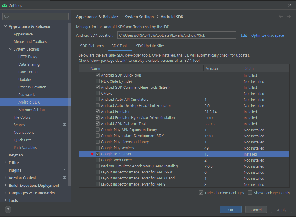 실제 Android 단말기를 연결해서 설치하거나 테스트 할 때 필요한 준비인데, Google USB driver만 설치 해 주면 됩니다.
