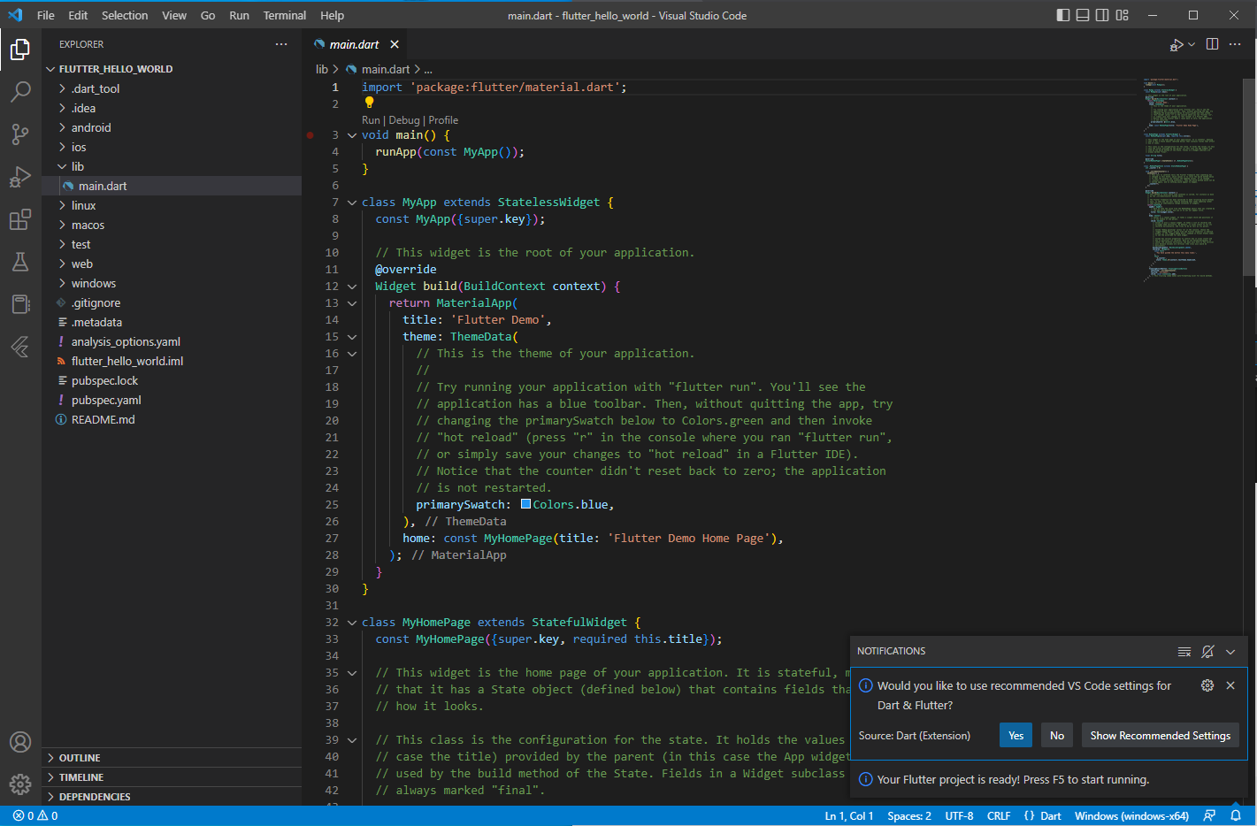 main.dart 파일을 열고, Title의 내용을 Hello, World로 변경합니다.