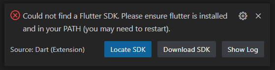 만약, VS Code에서 flutter를 찾지 못하면 아래와 같은 에러창이 뜰 수도 있는데, PATH 환경 변수에 SDK 경로가 설정되어 있지 않은지 한번 확인 해 보세요.