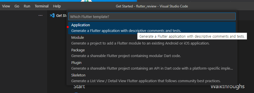 여러가지 옵션들이 있네요. 우선 기본 프로그램 만들어 보려고 하는 것이니, application을 선택 해 보겠습니다. 옆에 뜬 툴팁 내용을 보니 적합해 보이네요. 겸사겸사 다른 것들은 무엇이 있는지도 한번 읽어라도 봐두면 좋을 것 같아요.