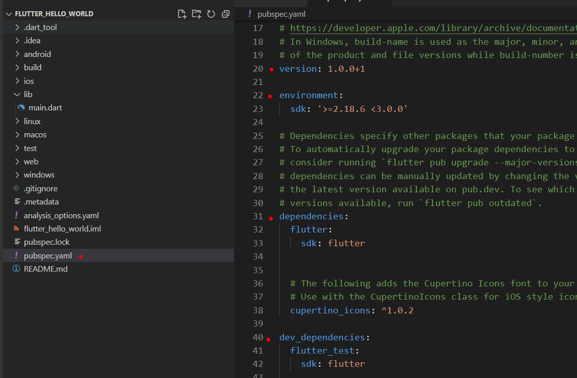 pubspec.yaml 파일이 중요한 설정을 하는 파일인 것 같아요. dependency 나 버젼 정보 이런거 앱 개발할 때 중요하잖아요.