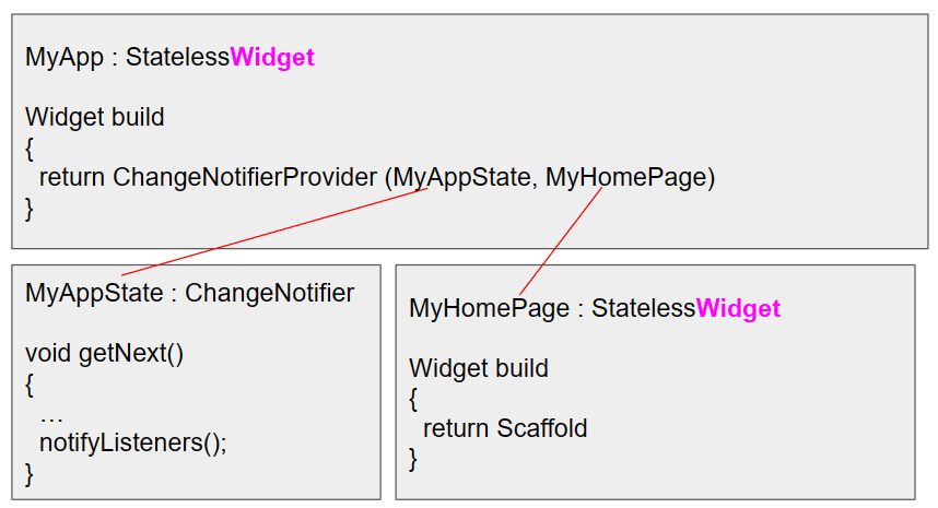 App의 State(변수?)를 관리하는 방법은 꼭 ChangeNotifer를 써야 하는 것은 아니고, 이 예에서 간단한 예를 보여주기 위해 선택한 것이라고 합니다. 변경된 내용을 BroadCasting하는 그런 역할을 할 때 사용하는 클래스인 것 같습니다.