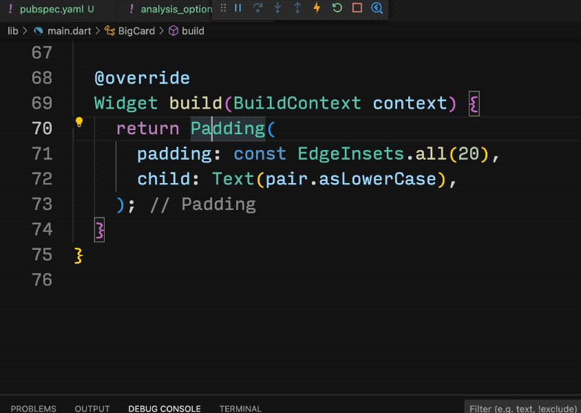 다음으로 실제 카드처럼 만드는 과정인데, Flutter에서 Widget을 다룰 때는 어떤 Widget을 다른 곳에 포함 시켜서 영향을 받도록 하는 과정이 많기 때문인지, Wrap... 과 같은 유형의 Context menu가 많이 보였습니다. 저 BigCard가 리턴해주는 Text를 그대로 리턴하지 않고, Card 모양으로 만들기 위한 처리를 추가 해 볼텐데, 이를 위해 Text 주변에 여백(Padding)을 추가 해 보겠습니다. 이를 위해 Padding 위젯 속으로 Text 위젯을 넣어야 하는데, 이를 간단히 해주는 context menu가 바로 Wrap with Padding입니다. 앞에서 이미 한번 해 보았던 Refactor를 한 후, 그 다음에 나오는 매뉴에서 선택 가능합니다.