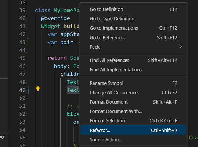 먼저, 화면에 보여질 wordpair를 조회 할 때 MyAppState에서 가져오는 부분이 Widget 설정부분에 묶여있어서 이를 State와 그 State의 data로 분리하는 수정을 하게 됩니다.아직은 이렇게 해야 할 이유를 딱히 모르겠습니다만, 일단 데이터를 설정하는 부분에서는 변경 될 여지가 있는 참조를 두지 않는 것을 지향한다 정도로 Refactoring을 하기 위한 준비라고 보면 될 것 같습니다.