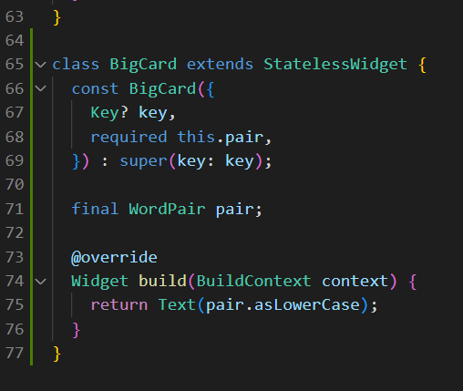 이렇게 하고 나면, Text Widget이 BigCard라는 클래스로 변경되고, 코드 가장 아래쪽에 BigCard라는 클래스가 추가 됩니다. BigCard가 원래 제공되는 클래스인지 정확히 모르겠네요. build 함수의 리턴값으로 Text Widget을 넘겨주고 있으니 아마도 그대로 실행해도 똑같이 될 것 같은데, 멤버로 WordPair가 있는 것을 보면 원래부터 있는 것 같기도 하고... 저장을 하고(Hot reload가 되고) 보니 이전처럼 보이는 것으로 봐서 기존의 Widget을 리턴 해 주되 다른 처리를 할 수 있는 형태로 변경하는 과정인 것 같습니다. 아직은 배경 지식이 부족하니 너무 고민하지 말고 일단 한번 따라가 보는데 의의를 두고 진행 해 보겠습니다.