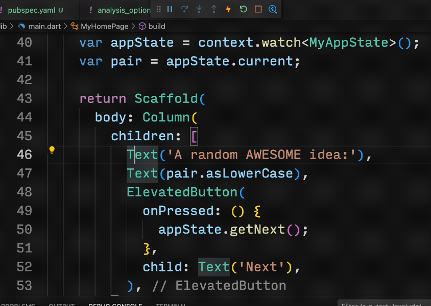 먼저, 화면에 보여질 wordpair를 조회 할 때 MyAppState에서 가져오는 부분이 Widget 설정부분에 묶여있어서 이를 State와 그 State의 data로 분리하는 수정을 하게 됩니다.아직은 이렇게 해야 할 이유를 딱히 모르겠습니다만, 일단 데이터를 설정하는 부분에서는 변경 될 여지가 있는 참조를 두지 않는 것을 지향한다 정도로 Refactoring을 하기 위한 준비라고 보면 될 것 같습니다.